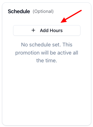 - Schedule: This will let you limit the promotion to specific hours. For instance, you have a "Tuesday Happy Hour" that goes from 2 to 5 pm, so any items purchase within those hours, will be discounted. Or you want the discount to be only on "2 for 1 Mondays." Anything outside the specified hours, won't be discounted.