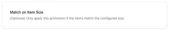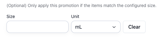 - Match on size: This field is optional and is only used when the promotion is limited to items of a specific size. For instance, "all bottles of 750ml." To make a selection, click on the section. This will open one text field, one drop-down menu, and a button.