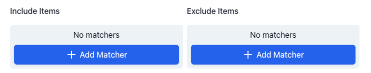 - Include Items: clicking the + Add Matcher button, select "Item," "department," or "tag."
